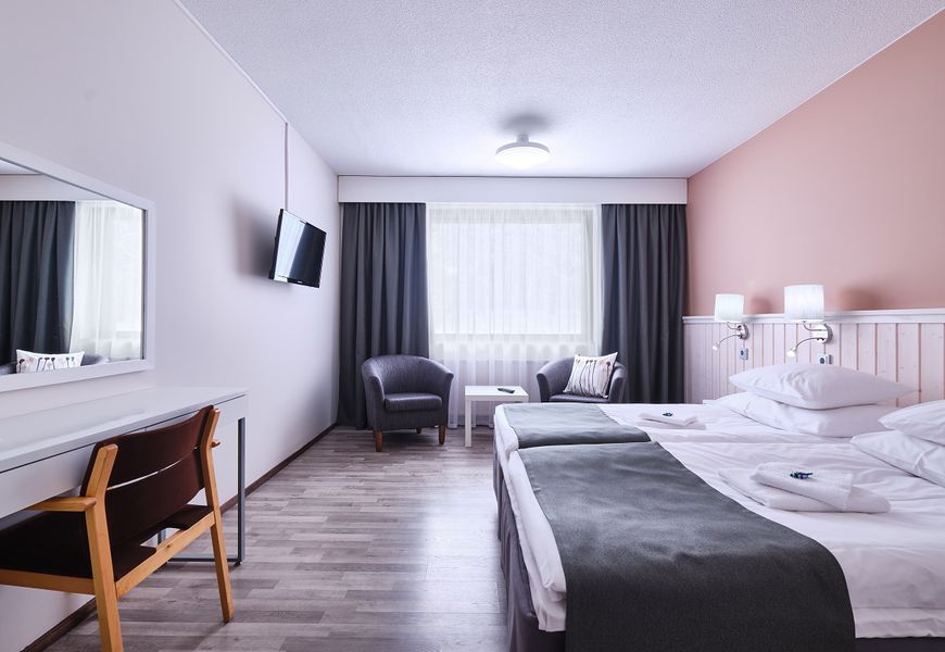 Pastelliväriset huoneet sointuvat ympäröivään luontoon. Jokaisessa huoneessa on 2 yhden hengen vuodetta, jotka voi tarvittaessa yhdistää parisängyksi. Huoneissa on TV, useita pistorasioita, Wi-Fi ja suihku / wc. Peruskorjaus huoneissa on tehty vuonna 2018.